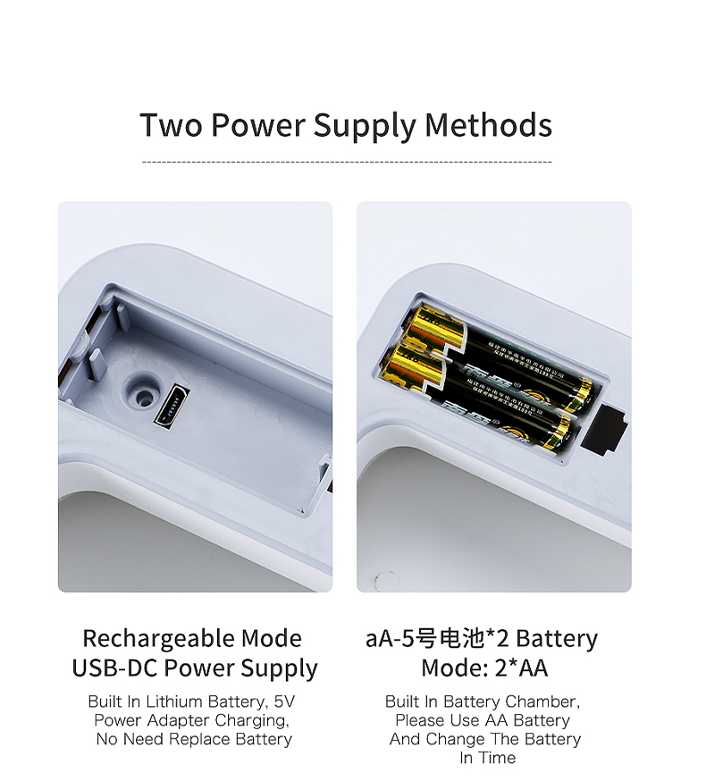 Power Supply: Battery Type (AA x 2) or Rechargeable USB DC Power Supply