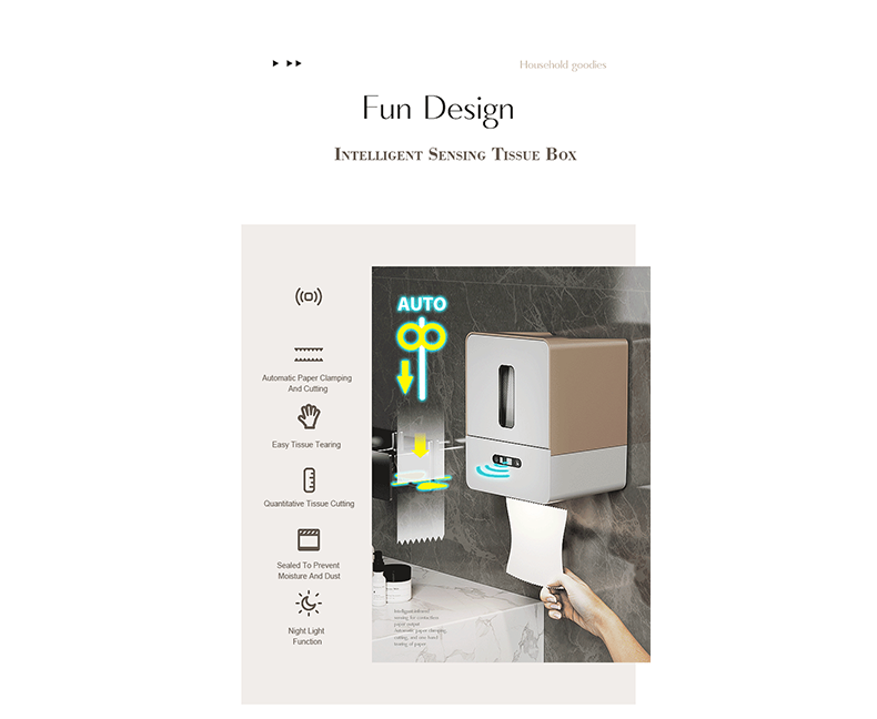 The Intelligent Sensing Tissue Box is a cutting-edge tissue dispensing solution designed for modern households and businesses. It integrates advanced technology for a more hygienic, convenient and customizable tissue dispensing experience.